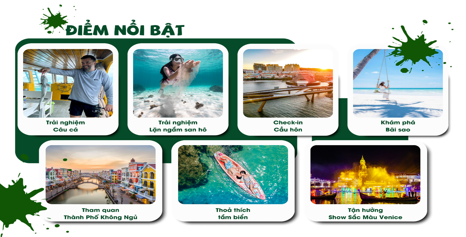 - Chương trình Tàu câu cá – lặn ngắm san hô: Khởi hành ra biển, trải nghiệm câu cá và lặn ngắm san hô với đầy đủ trang thiết bị.